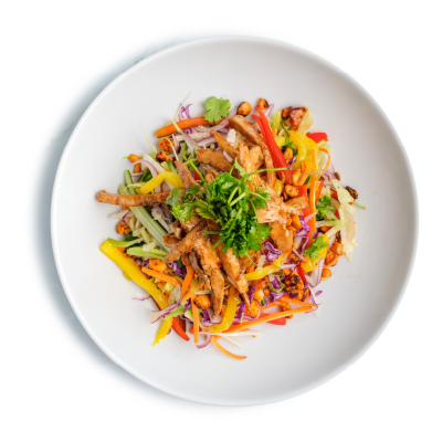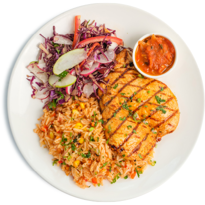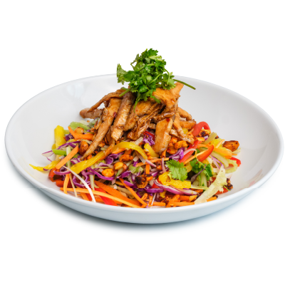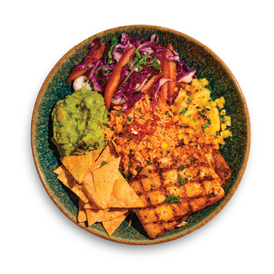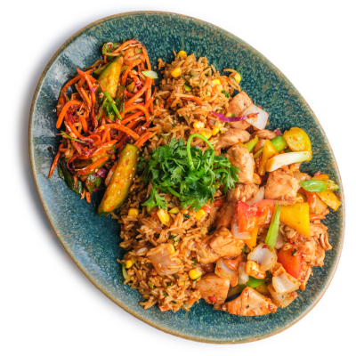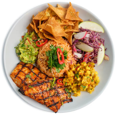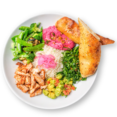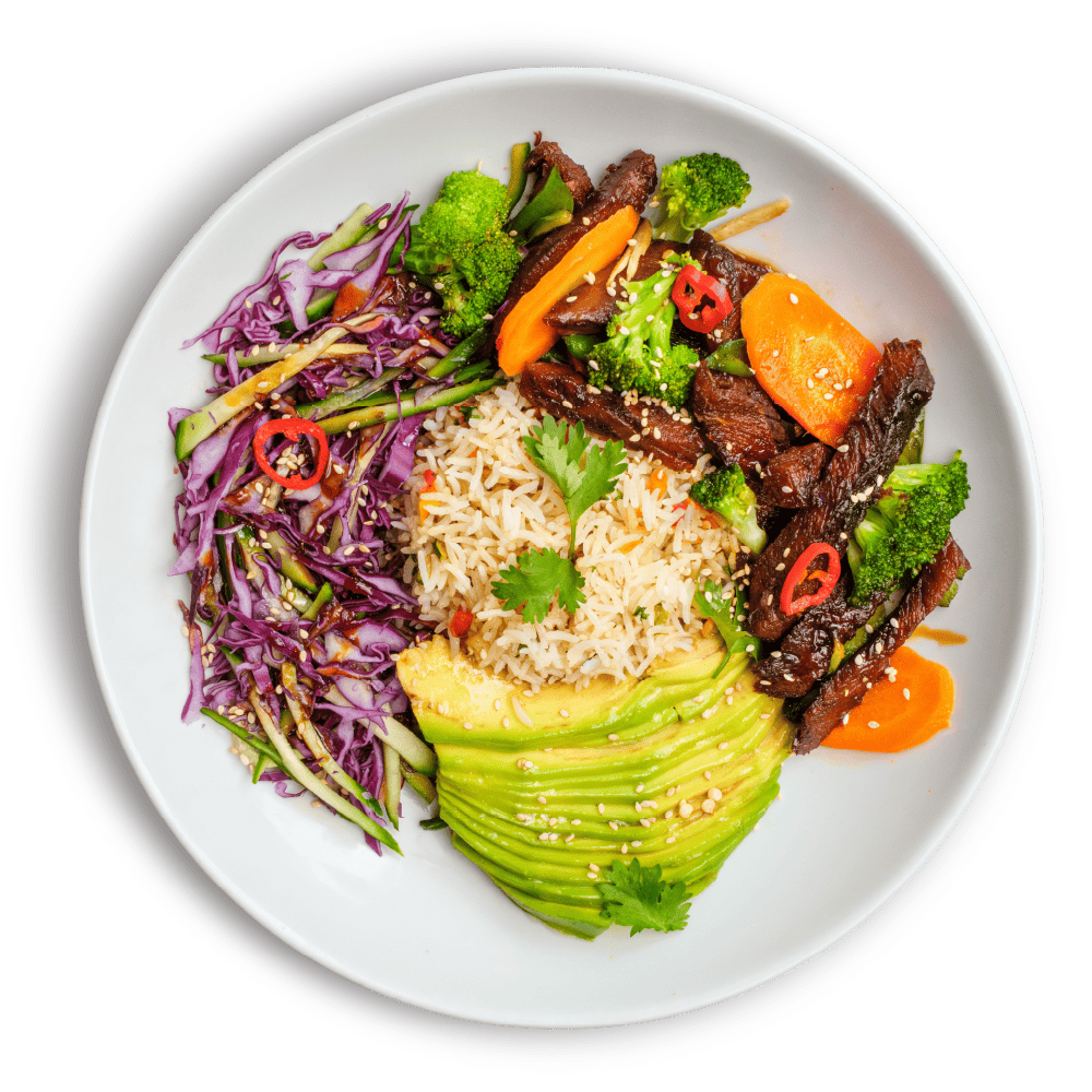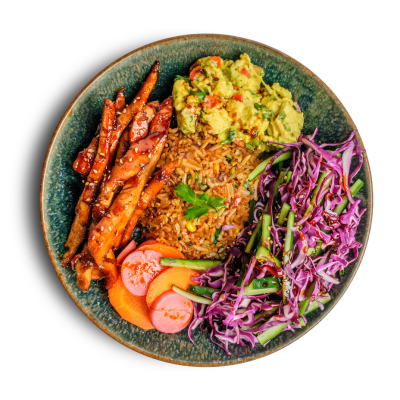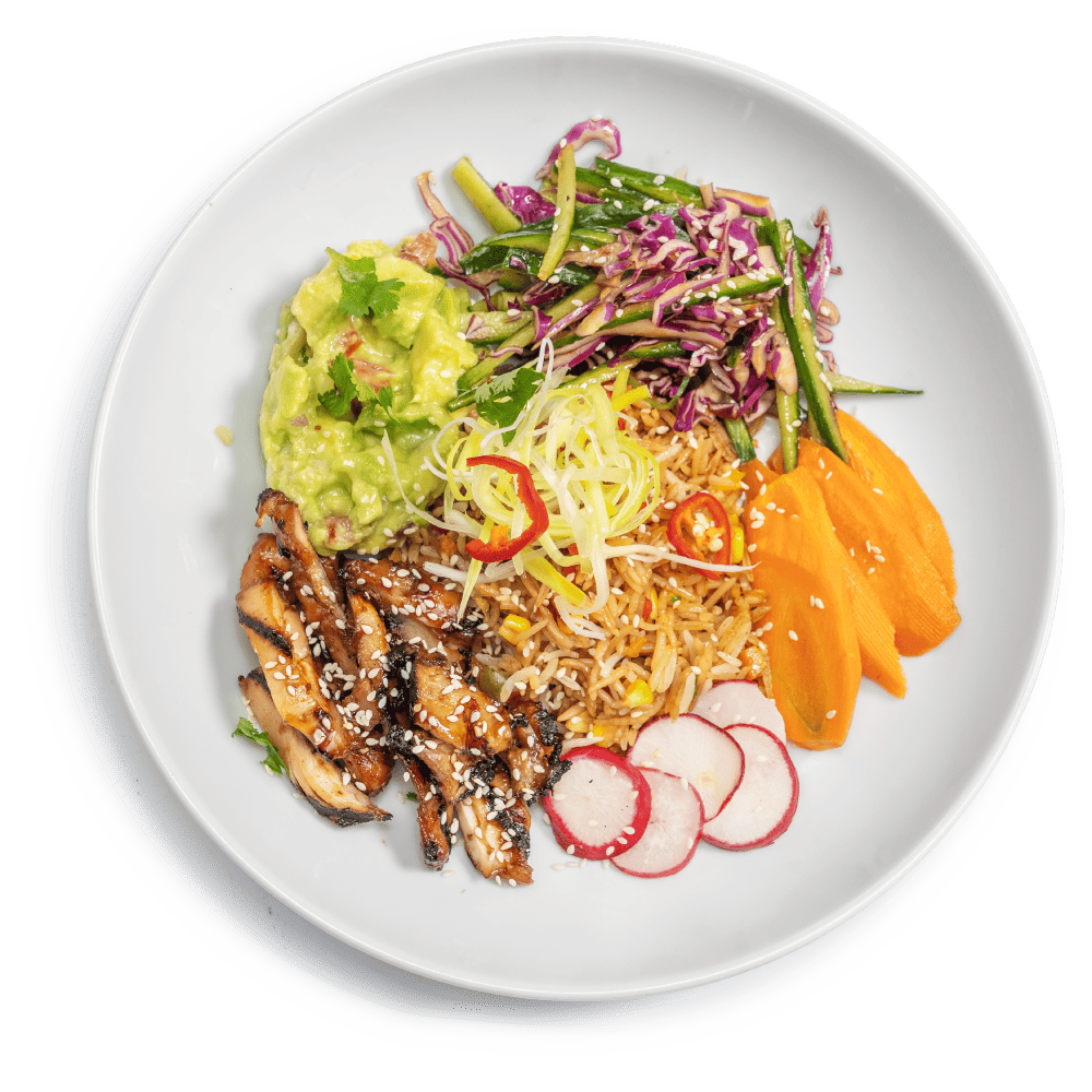 "description": "Teriyaki chicken paired with fragrant fried rice, Asian red cabbage slaw, pickled carrots, radish, & guacamole.",