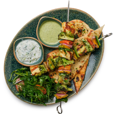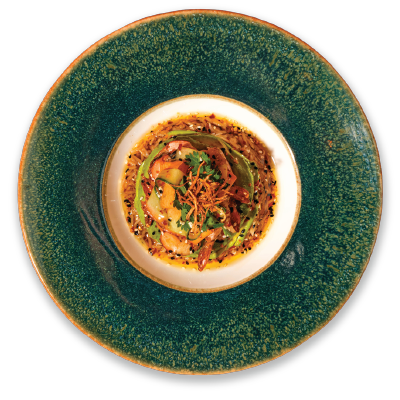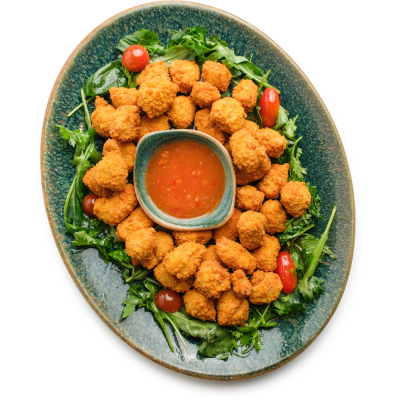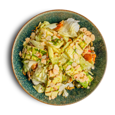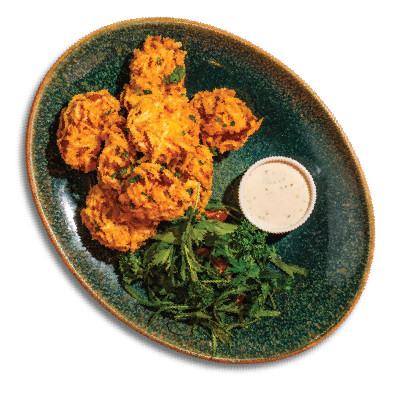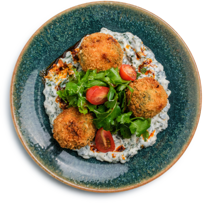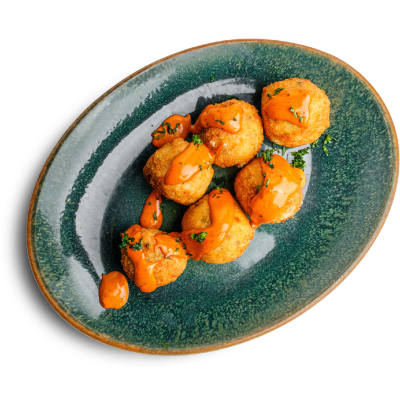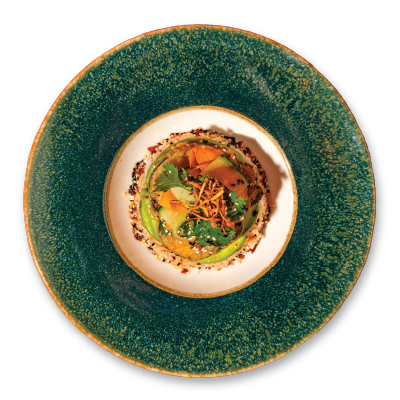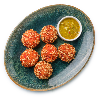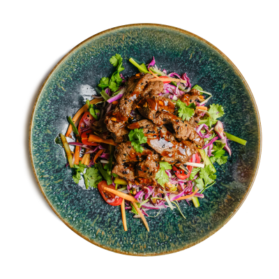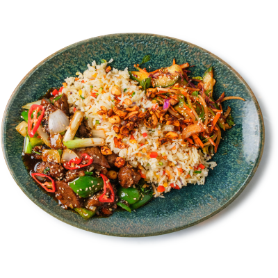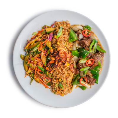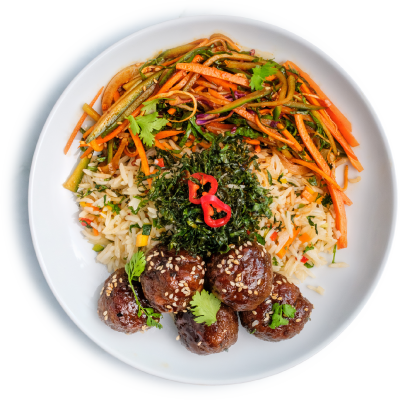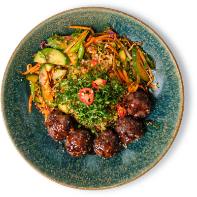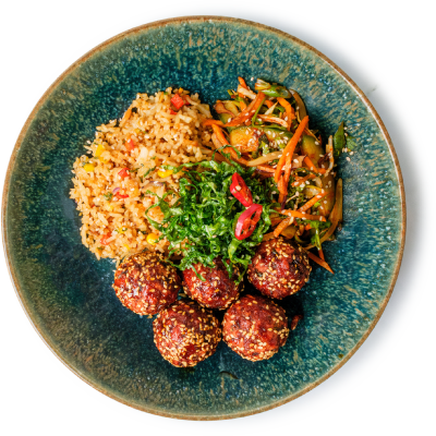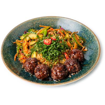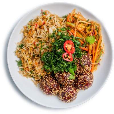 "description": "A hearty bowl with teriyaki meatballs, Korean cucumber salad, fried rice, crispy kale, and garnished with sesame & spicy nuts.",